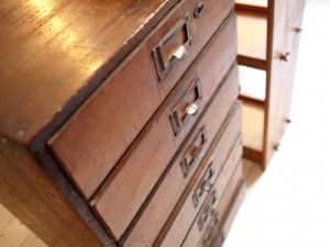 ネームプレートの取っ手が付いた小引き出し。